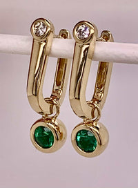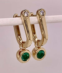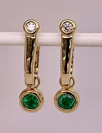 14K yellow gold diamond and emerald hoop style earrings. .15 carat total diamond weight. .50 carat total emerald weight. 7/8" drop. Earrings can be worn with or without emerald charms. 4.64 grams.