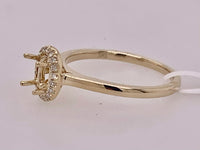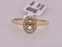 14k yellow gold.  Oval shape halo semi mount with diamonds.  .08ct.tw. diamonds.  Can be set with a .75ct.-1.00ct. oval center stone.  2.44gr.