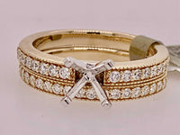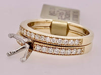 14k two tone gold mill grain edge semi-mount with matching band. .50ct.tw. diamonds. Center will hold an approx. 1 ct. stone.