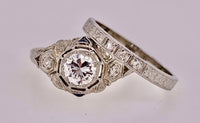 Estate 18k white gold Filigree wedding set containing one approximate .50ct. old European cut diamond with small triangle sapphire accents. 5.3 grams/set.