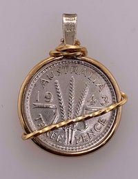 1943 Australia three pence coin set in gold artesian wire.