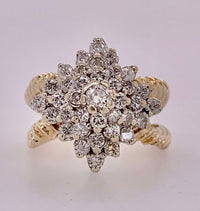 14k yellow gold estate diamond cluster ring containing approximate 1.25 carat SI1-SI2 clarity GHI color round brilliant cut diamonds. 9.3 grams.