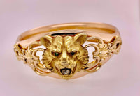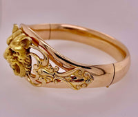 Estate ornate gold-filled bangle featuring Lion's head with simulated emeralds and diamond. 7.5"-8" wrist.