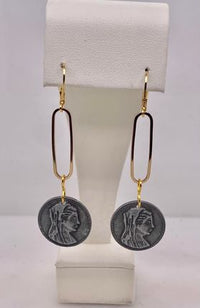 Lever back two-tone paperclip and antique reproduction double sided coin.