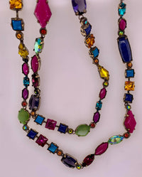 Angular, geometric cabochons with a natural feel pair with multi-shaped crystals for a versatile look that you can rock just as easily in the conference room as at a concert! Antique gold finish. Length: 36". Regular price $500. FINAL SALE!