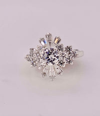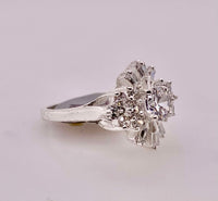 Sterling silver cluster style ring containing round and baguette shape cubic zirconia stones forming a snowflake design. Size 9.