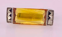 Sterling silver ring containing a citrine-colored rectangle shape cubic zirconia accented with marcasite stones. Size 6.5.