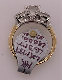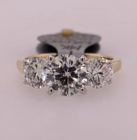 14k two tone round LAB diamond ring. Center stone: 1.50cts. Side stones: .75ct. each. Total LAB diamond weight: 3cts. VS2 clarity, F color. Size 7.